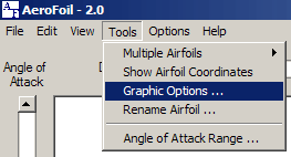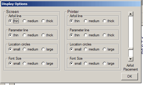 The various lines, location circles, and font sizes used in the graphical displays and printed output may be altered using the radio buttons. The vertical location of the airfoil on each display may be adjusted using the vertical slider bar.