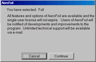 As a REGISTERED copy of AeroFoil, all of the calculations and displays will be available and the single-user license will not expire. It will not be possible to save or print any results. Limited technical support will be available via e-mail. At any time, the REGISTERED user may upgrade to a higher level. In this case, limited technical support means that questions about program execution will be answered. Any questions concerning aeronautical terms or concepts will NOT be answered.