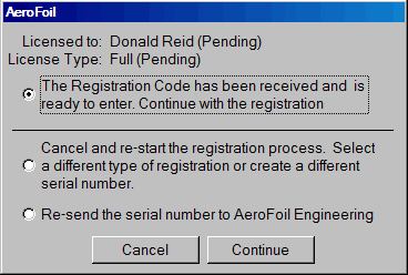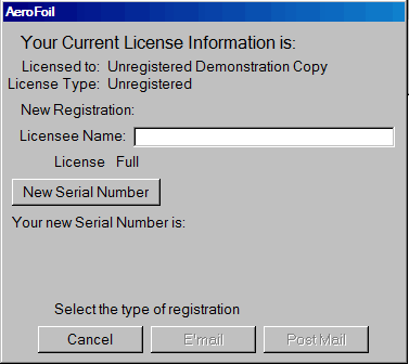 A single-user license will be issued to AeroFoil in one of four types. Anyone who registers AeroFoil though the e-mail system will be notified of developments and improvements to the program.