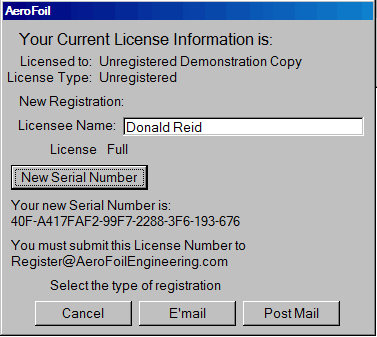 Upon completion of the registration process, AeroFoil is licensed to a single user on a single computer. The license registration will not function on any other computer. If the Licensee needs to transfer the application to a different computer, contact AeroFoilEngineering.com