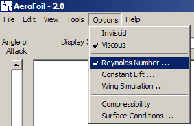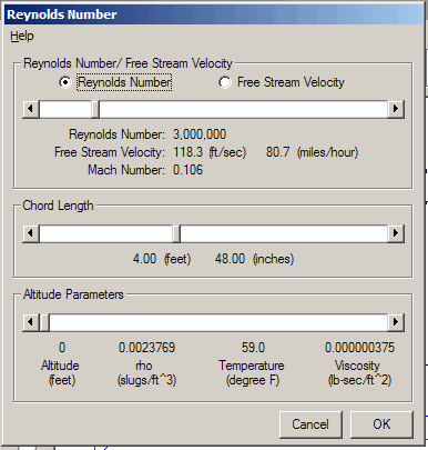 The viscous calculations depend upon the characteristics of the fluid. The user may select a specific Reynolds number in order to replicate published wind tunnel data, or as an option, select the free stream velocity, altitude, and chord to calculate the Reynolds number. All of the airfoil and atmospheric parameters are controlled by the slider bars or by manually entering the values.