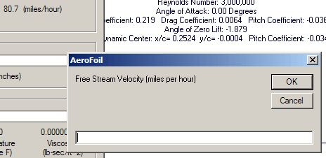 The Reynolds Number, either free stream velocity, either chord length, and the altitude values may be entered by left clicking over the numeric value and typing the desired value in the text box.